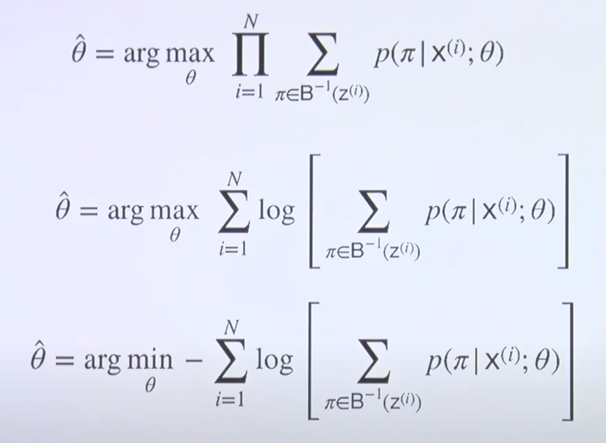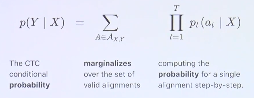 - 즉, input과 output 사이 가능한 align을 모두 뽑아서 marginalize 하겠다는 의미다.