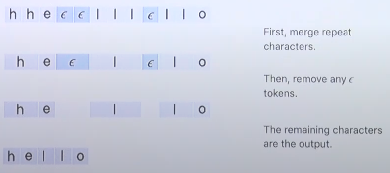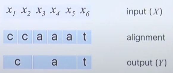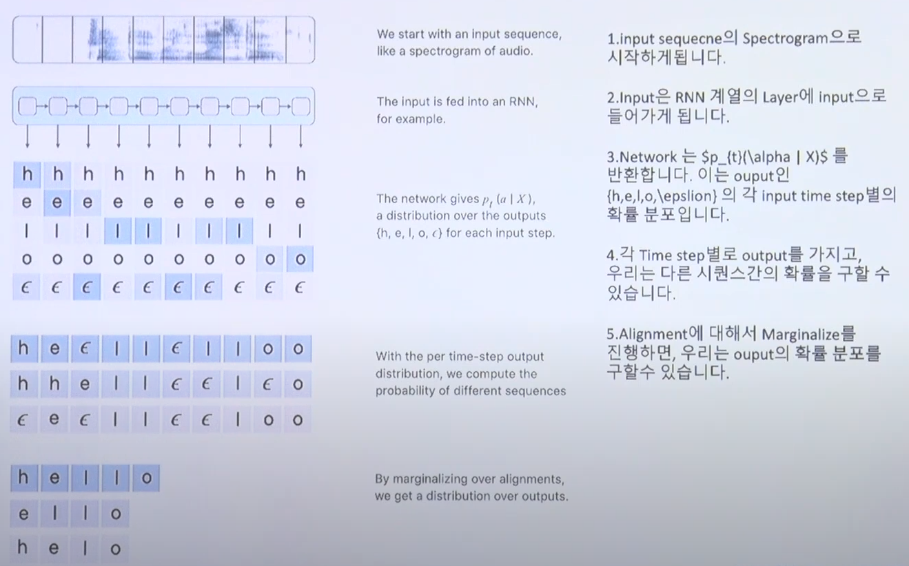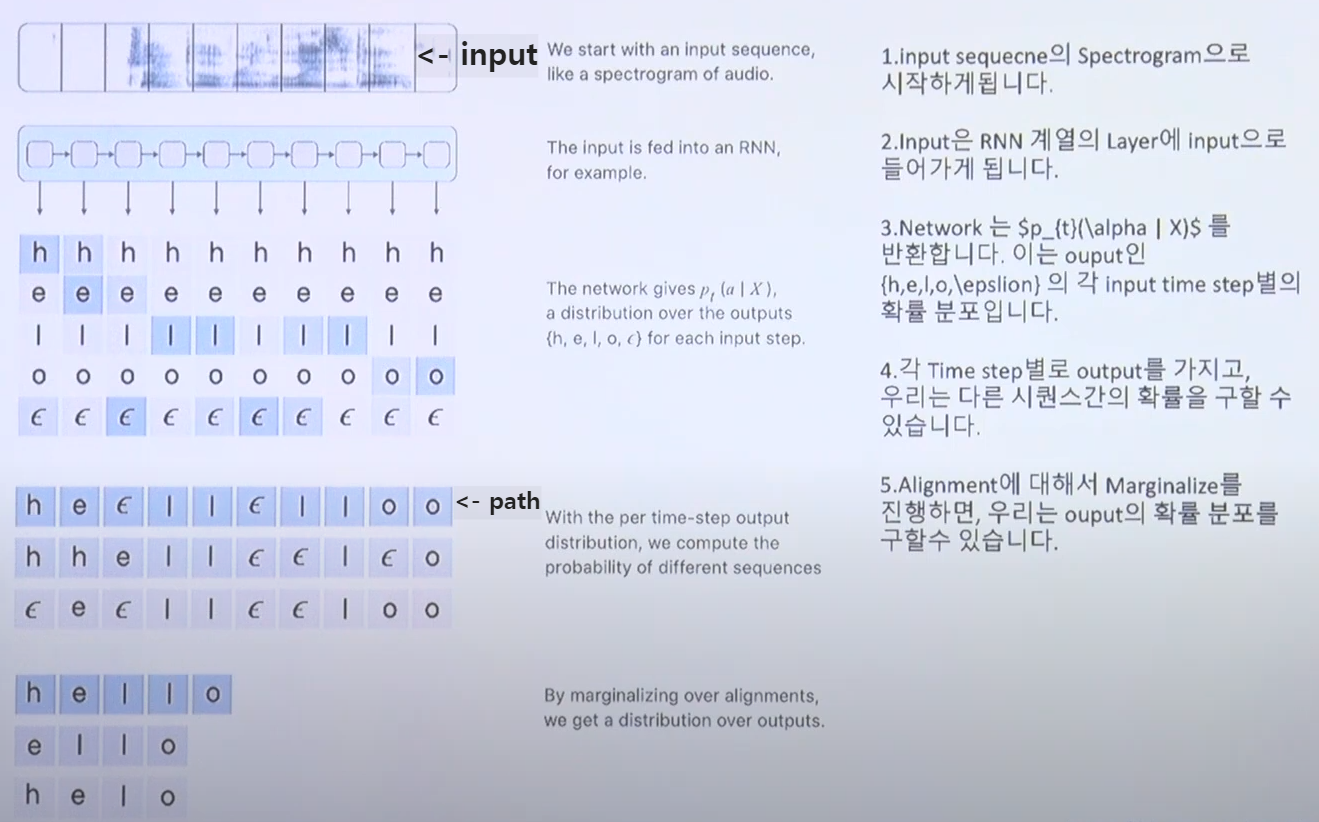 - CTC는 input과 같은 길이의 alignment를 만들고 y로 mapping 하면서 \epsilon을 제거하면 해당 output과 길이가 같은 결과를 얻을 수 있다.