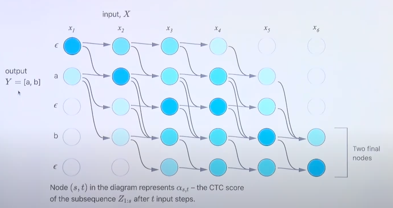 - (X,Y)의 pair dataset에 대해서, 각각의 X는 input step을 따라가면서 step-by-step으로(시간축을 따라감) single alignment의 확률을 계산한다.